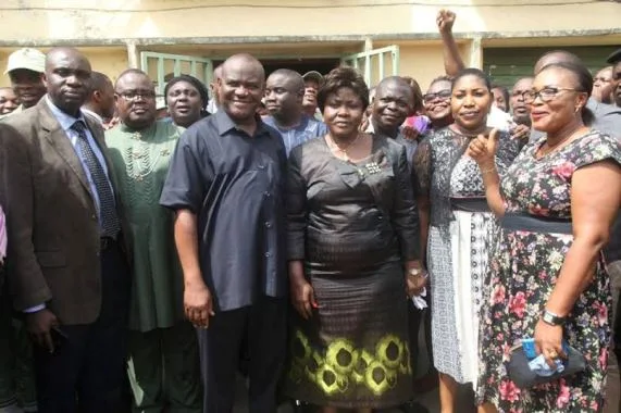 Rivers state governor, Nyesom Wike, today paid a condolence visit to the National Youth Service Corps in the state to commiserate with them on the killing of of a corps member, Samuel Okonta, during the re-run election held last Saturday, March 19. Okonta, who served at GCSS Ukpeliede was shot dead by unknown gunmen in Ahoada West L.G.A of the state. More photos after the cut..